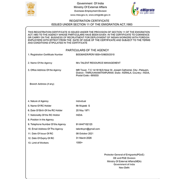 Talent Resource Management services have been around for years providing honest service to our valuable clients. It is our pride to present ourselves as a trustworthy HRM service and leading manpower consultant that has been approved by the Ministry of External Affair and Overseas Indian Affairs. Having offices in India and associates In Nepal, Srilanka & the Philippines, we have been satisfying our client's manpower requirements by providing professional, skilled, semi-skilled, and unskilled personnel across various Industries.